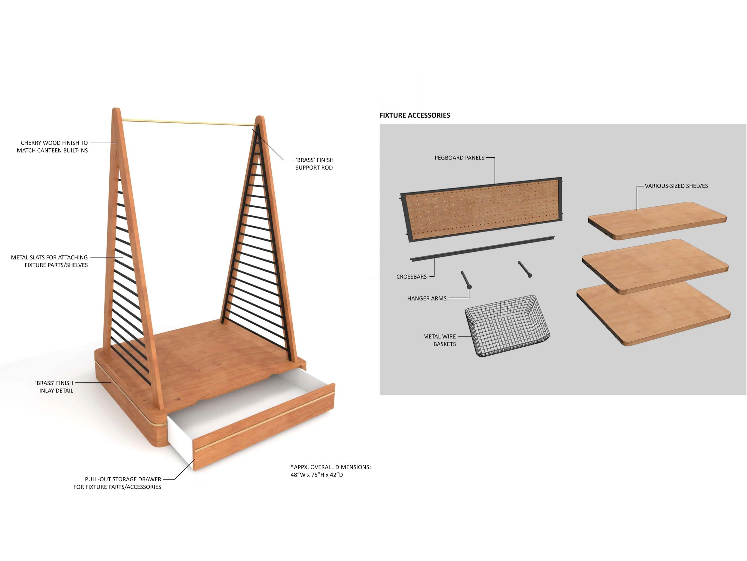 A custom collection of permanent display fixtures designed for CAMP experience stores. Ranging from adjustable A-Frame units, Tiered Tables, Flag Pole Bag & Accessory Posts, Nesting Tables and Impulse-Buy Fixtures. In keeping with the current CAMP look-and-feel these fixtures take cues from picnic and camping themes and are constructed out of metal, cherry wood and brass accent finishes to integrate into their Canteen Shop.